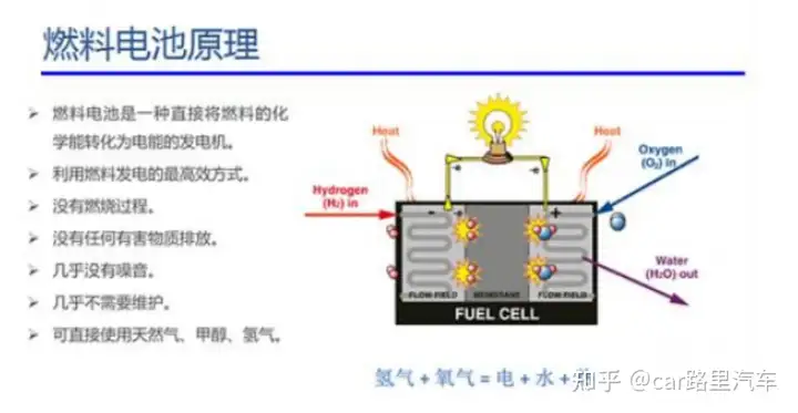 相比蓄电池,目前十分小众的氢燃料电池是真正意义上“零排放”的清洁能源,它将氢气和氧气的化学能直接转换成电能的发电装置。基本原理就是电解水的逆反应,把氢和氧分别供给阴极和阳极,氢通过阴极向外扩散和电解质发生反应后,放出电子通过外部的负载到达阳极,只会产生水和热。